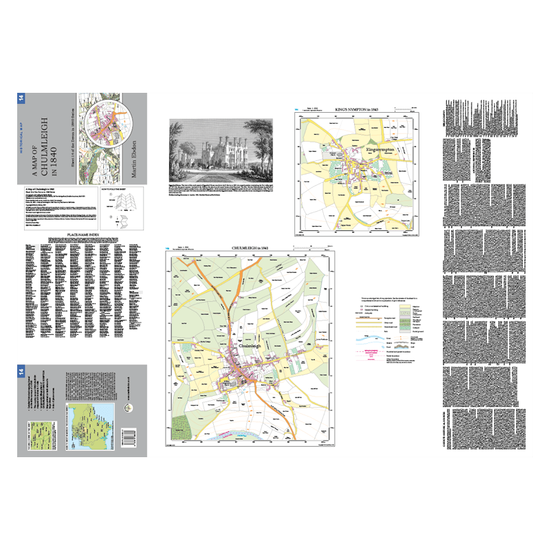 The maps on sheet 14 show the Chulmleigh district as it was around 1840. The maps show buildings, roads (with turnpike roads and toll-gates distinguished), rivers and streams, field boundaries and cultivation, woodland, parkland, orchards, archaeological features, historic parish and hundred boundaries, and a host of small features of the landscape. The maps include a considerable number of field-names.